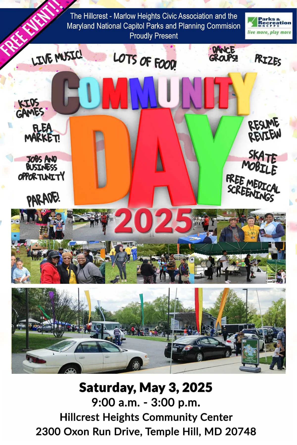 The Hillcrest-Marlow Heights Civic Association and the Maryland-National Capital Park and Planning Commission proudly present Community Day 2025—a vibrant and inclusive celebration for families, neighbors, and local organizations!